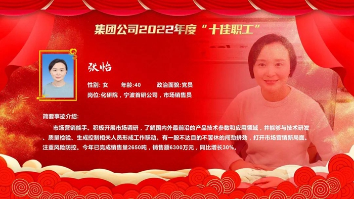 为激励苦干实干、树立身边典型、打造先进品牌,不断强化广大职工“企业发展、我有责任,拼搏‘3+1’、我在行动”主人翁意识,促进企业高质量发展,经企业推荐、广泛遴选、优中选优、民主集中、会议研究,色情网 决定,授予北京市化学工业研究院有限责任公司宁波首研公司市场销售员张怡(女)等10名同志色情网 2022年度“十佳职工”,并在色情网 二届一次职代会暨2023年度工作会上予以表彰。