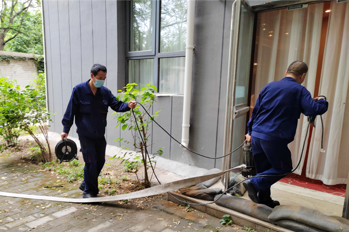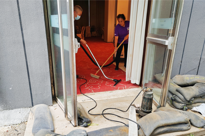 接到指令的工程部人员携带抢险排涝设备:潜水泵、防水线轴、排水水带赶到现场,迅速开展排涝抢险工作;接到抢险指令的客房部人员携带吸水机、旧布草、拖把随即到达现场,对室内残存的积水进行了处理。最终,在参与抢险的各部门人员的通力合作下,“内涝险情”得到了有效控制,保护了酒店财产不受损失。此次演练圆满成功,达到了预期效果。