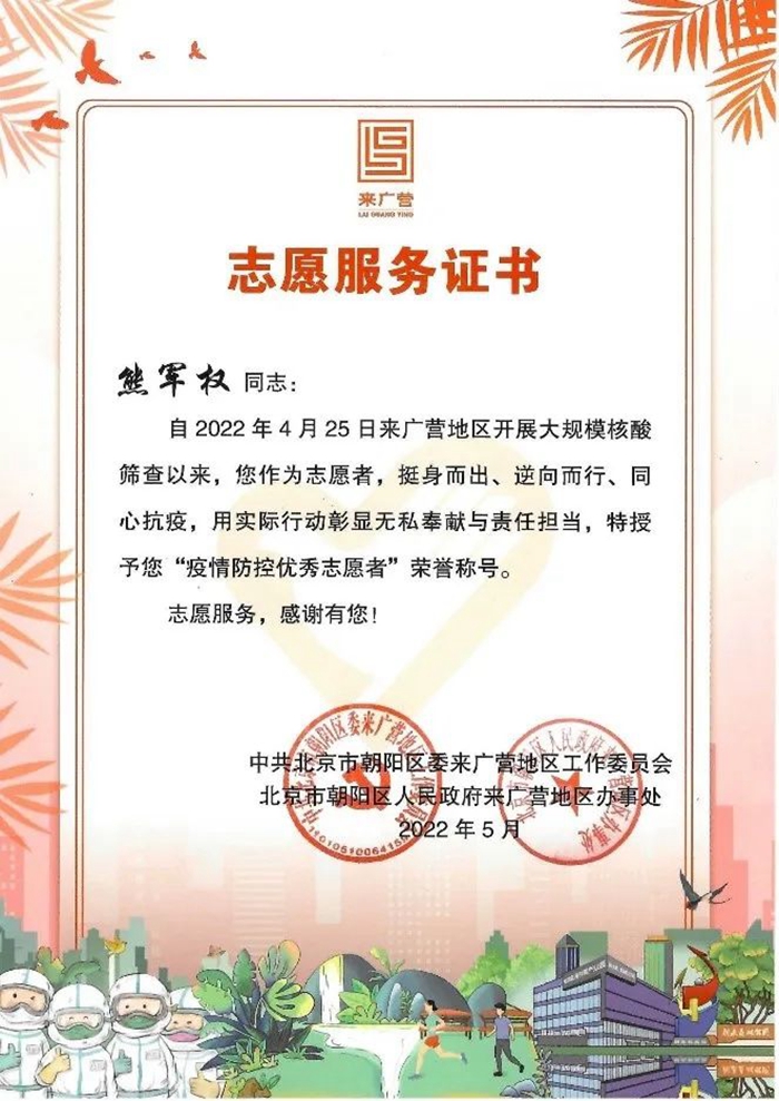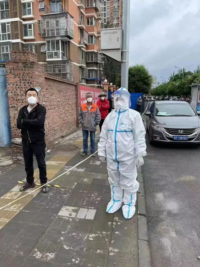 眼看天气越来越热,北京出现连续高温,为更好地保护负责检测的医护和社工人员,社区决定下午一点停止检测,可是这个举动开始并不被居民们理解,往往到了一点之后还是有人陆陆续续前来测核酸。每每这个时候,我总会站到队尾向大家解释,告诉他们坐在隔离舱内检测人员的不容易,请大家换位思考给予谅解。虽然有时会面对许多质疑的声音,但我依旧会保持一份热情、一份理解、一份关爱,因为我坚信,这身防护服带给我的是荣耀、是真真切切为人民服务的标识。现在,居民们渐渐理解了工作人员的不易,我也感受到了居民们的通情达理和关爱。