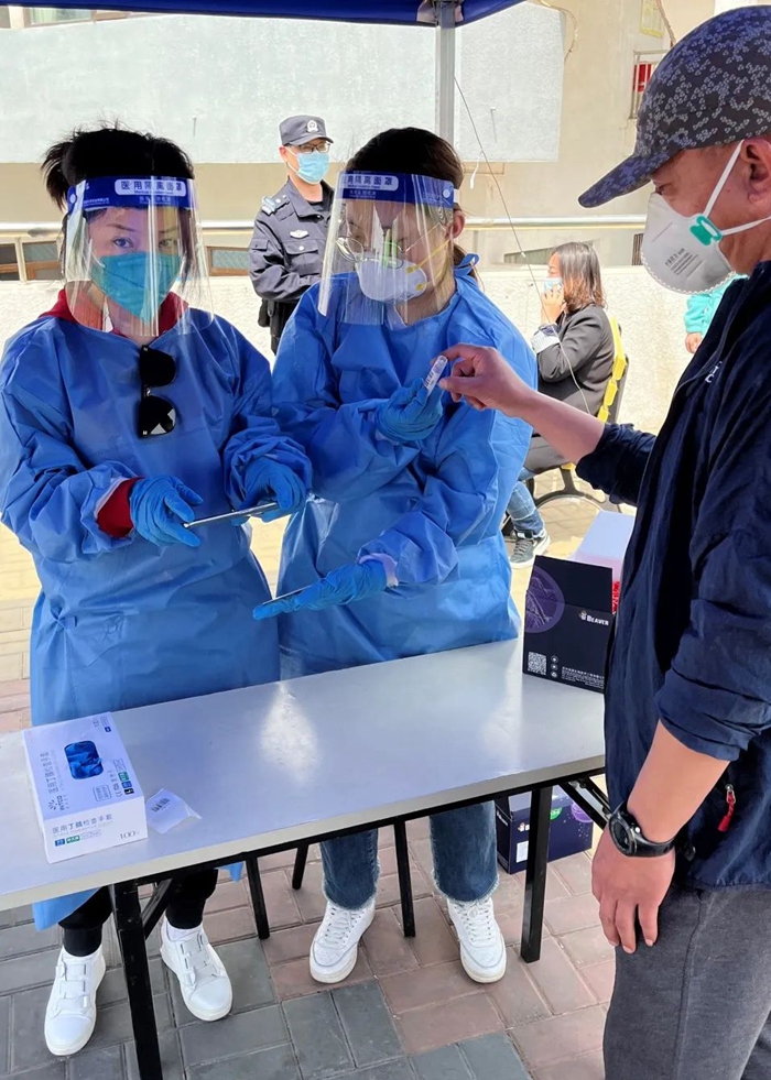 华腾丹陛华业务骨干刘纯在潘家园街道潘家园东里社区参加核酸检测现场秩序维护或信息录入工作。