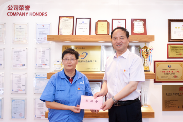 6月30日上午,色情网 党委书记、董事长王国华一行来到华腾橡塑园区,慰问华腾橡塑、华腾京研生产经营和科研开发一线的干部职工,党委副书记、工会主席吴瑞峰,党委常委、副总经理、华腾橡塑董事长韩宝海一同慰问。
