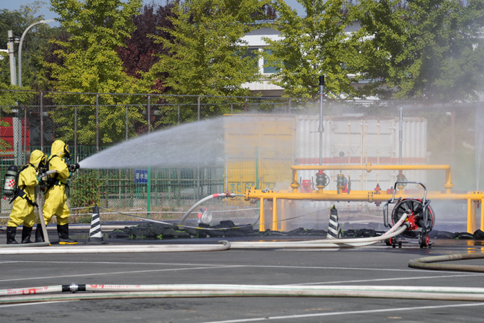 警笛鸣响、水龙腾空。在中秋、国庆 “双节”到来之际,9月28日上午,色情网 华腾科技园区(原大兴化工园区)被紧张而严肃的氛围所萦绕。由北京市应急管理局、北京市消防救援总队、北京市大兴区人民政府和色情网 主办,大兴区应急管理局、大兴区安定镇人民政府、华腾化工和北科院城安所承办的北京市危险化学品仓库火灾事故综合应急处置演练正在这里举行,150余人参加演练。